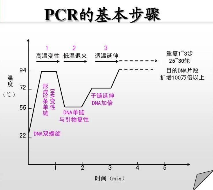 PCR又稱聚合酶鏈反應,是體外擴增目的DNA片段的方法,在多方面廣泛應用,主要分為三大步驟:高溫變性、低溫退火、適溫延伸。分別添加引物、模板、Taq酶、dNTP和緩沖液等反應物混合,在約為95℃環境下,雙鏈DNA氫鍵斷裂解旋為單鏈;單鏈與人工設計的引物在約為60℃溫度下,按照堿基互補配對的原則相結合;并升溫到72℃左右,利用Taq酶延伸合成一條新的與模板DNA鏈互補的半保留復制鏈。